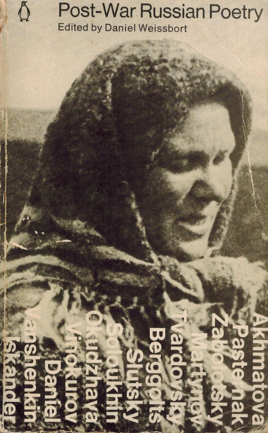 Шифр: 1/10б Post-War Russian Poetry. Edited with an introduction by Daniel Weissbort. All unattributed translations are by Daniel Weissbort. Penguin Press, 1974. Аннотация: Анна Ахматова, Борис Пастернак, Николай Заболоцкий, Леонид Мартынов, Александр Твардовский, Ольга Берггольц, Борис Слуцкий, Владимир Солоухин, Булат Окуджава, Евгений Винокуров, Юлий Даниэль, Константин Ваншенкин, Фазиль Искандер, Глеб Горбовский, Герман Плисецкий, Римма Казакова, Роберт Рождественский, Евгений Евтушенко, Андрей Вознесенский, Новелла Матвеева, Виктор Соснора, Наталья Горбаневская, Александр Кушнер, Белла Ахмадулина, Юнна Мориц, Иосиф Бродский. Источник поступления: Собрание В.П. Полухиной. Рубрики: Русская поэзия Персоны: Ахмадулина Белла Ахатовна / Akhmadulina Bella, Ахматова Анна Андреевна / Akhmatova Anna, Евтушенко Евгений Александрович / Evtushenko (Yevtushenko) Evgeni, Горбаневская Наталья Евгеньевна / Gorbanevskaya Natalya, Слуцкий Борис Абрамович / Slutsky Boris, Соснора Виктор Александрович / Sosnora Victor, Вознесенский Андрей Андреевич / Voznesensky Andrei, Заболоцкий Николай Алексеевич / Zabolotsky Nikolai, Берггольц Ольга Федорона, Горбовский Глеб Яковлевич, Даниэль Юлий Маркович, Искандер Фазиль Абдулович, Кушнер Александр Семенович, Мартынов Леонид Николаевич, Матвеева Новелла Николаевна, Мориц Юнна Петровна, Пастернак Борис Леонидович, Рождественский Роберт Иванович, Твардовский Александр Трифонович