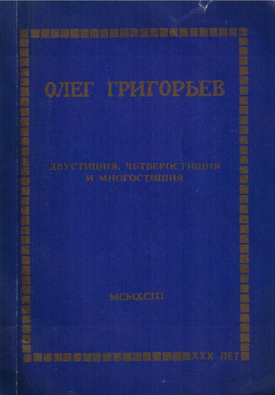 Шифр: 3/5б Григорьев Олег Евгеньевич Двустишия, четверостишия и многостишия. СПб.: Ассоциация "Камера хранения", 1993. - 124 с. Источник поступления: Собрание В.П. Полухиной. Рубрики: Русская поэзия
