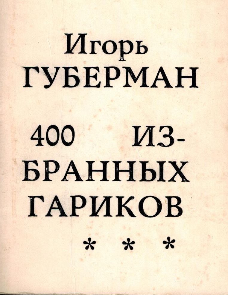 Шифр: 3/5б Губерман Игорь Миронович 400 избранных гариков. Сост. Алексей Уклеин. [б.г.]. - 80 с. Надписи: Автограф автора: " Ребята, кто-то слепил в Калуге, я не отвечаю". Источник поступления: Собрание В.П. Полухиной. Рубрики: Русская поэзия