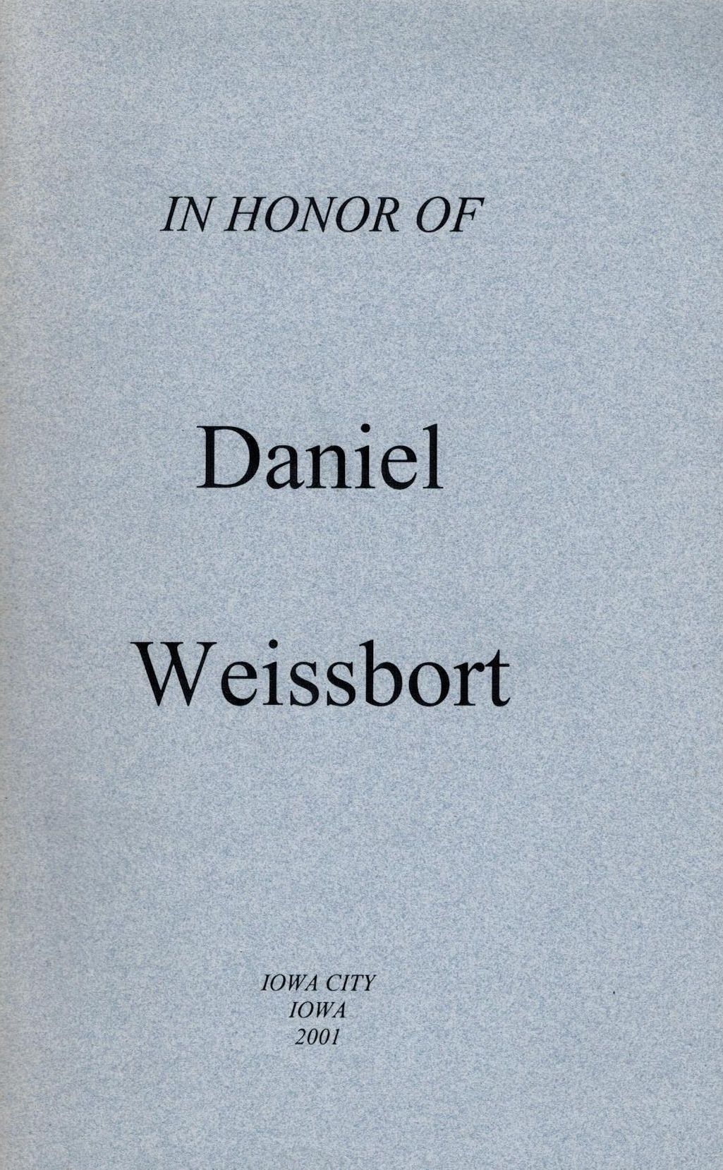 Шифр: 2/9б Weissbort Daniel In Honor of Daniel Weissbort. Iowa City, 2001. - 56 p. Аннотация: Presented on the occasion of the second annual Paul Engle Festival of the International Writing Program at the University of Iowa, October 12-14, 2001, in celebration of Daniel Weissbort's years of service, inspiration, persistence, and good spirits as Director of the Translation Worshop and the M. F. A. degree in Translation, Department of Cinema and Comparative Literature. Источник поступления: Собрание В.П. Полухиной. Рубрики: Зарубежная поэзия и проза
