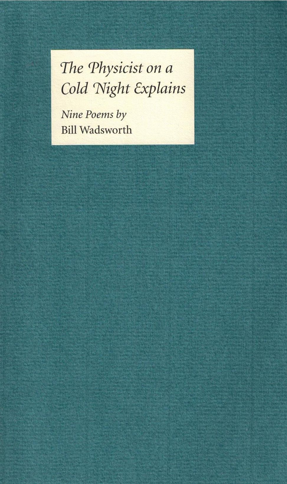 Шифр: 2/8б Wadsworth William The Physicist on a Cold Night Explains. Nine Poems. Breakaway Press, 2002. - 24 p. Надписи: Дарственная надпись В.П. Полухиной и Д. Уайссборту от автора. Источник поступления: Собрание В.П. Полухиной. Рубрики: Зарубежная поэзия и проза Персоны: Уайссборт Дэниел / Weissbort Daniel