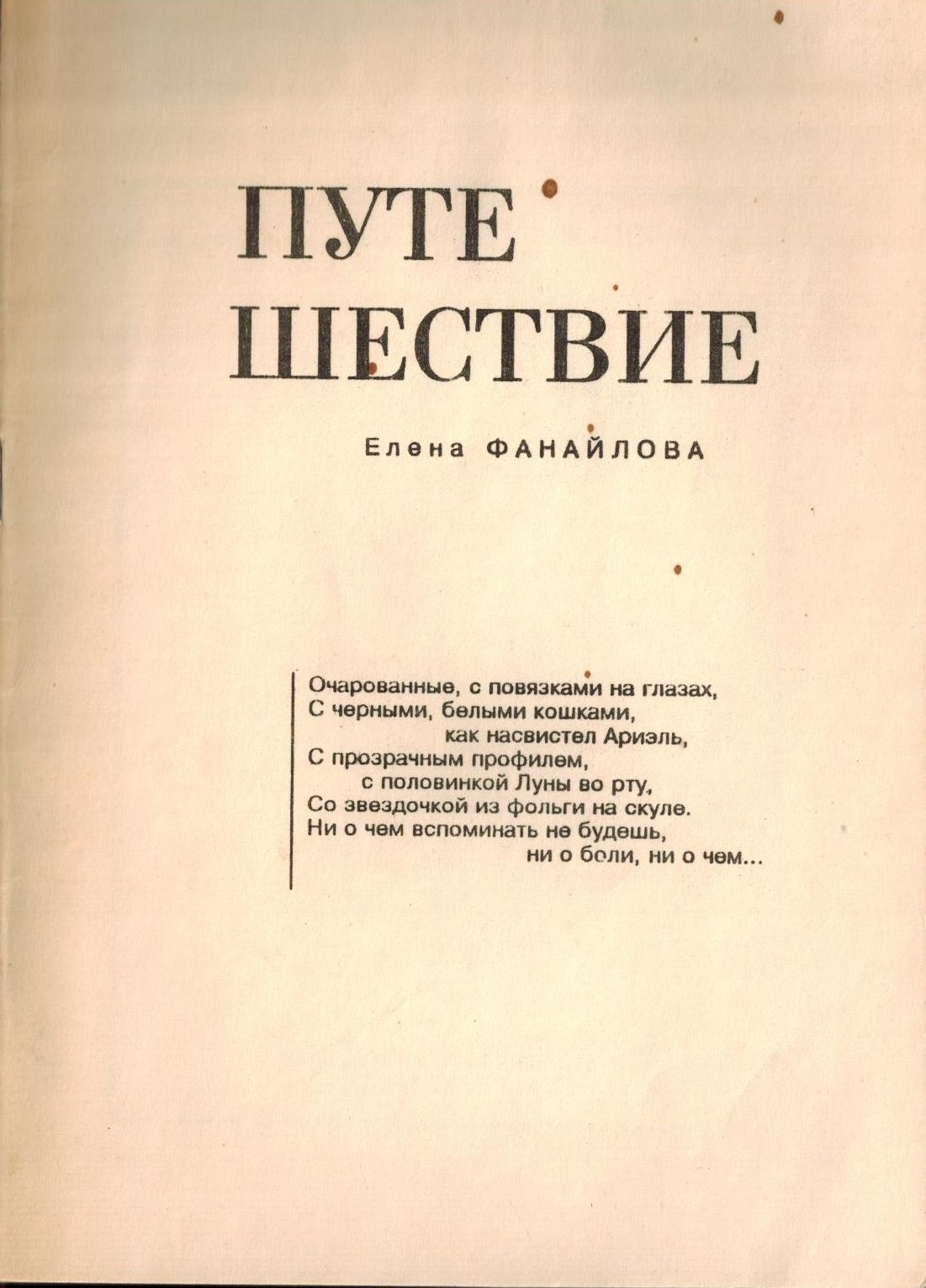Шифр: 3/10а Фанайлова Елена Николаевна Путешествие. Предисл. Аркадия Драгомощенко. СПб.: Митин журнал, 1994. - 36 с. Аннотация: Тираж 300 нумерованных экземпляров. В библиотеке музея: № 52 и 3 экз. без номера. Надписи: Инв. 1370/1 - Дарственная надпись В.П. Полухиной от автора. 1996. Источник поступления: Собрание В.П. Полухиной. Рубрики: Русская поэзия Персоны: Драгомощенко Аркадий Трофимович