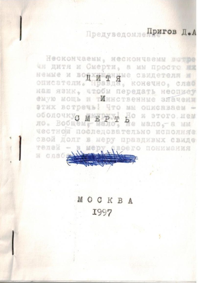 Шифр: 3/9а Пригов Дмитрий Александрович Дитя и смерть. М., 1997. - [Самиздат]. Источник поступления: Собрание В.П. Полухиной. Рубрики: Русская поэзия
