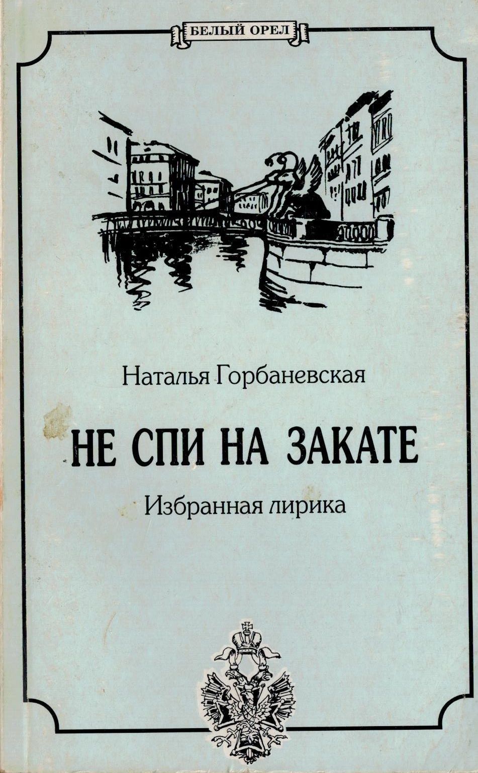 Шифр: 3/5б Горбаневская Наталья Евгеньевна Не спи на закате: Избранная лирика. СПб.: Лики России, 1996. - 303 с. Надписи: Инв. 1468/1 - Дарственная надпись В.П. Полухиной от автора. 24.06.1997. Инв. 1468/2 - Дарственная надпись Д. Уайссборту от автора. 24.06.1997. Источник поступления: Собрание В.П. Полухиной. Рубрики: Русская поэзия