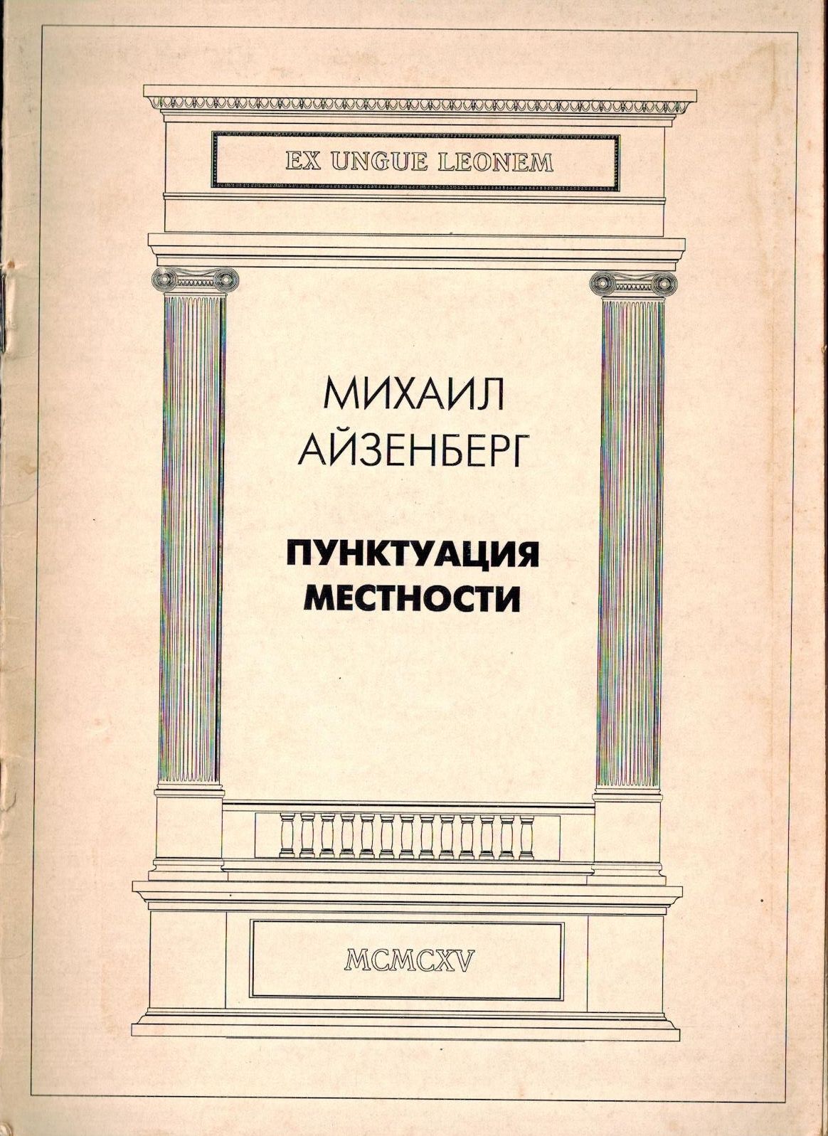 Шифр: 3/4а Айзенберг Михаил Натанович Пунктуация местности : Стихи. М.: Арго-Риск, 1995. - 16 с. - ("Ex ungue leonem", вып. 2). Источник поступления: Собрание В.П. Полухиной. Рубрики: Русская поэзия