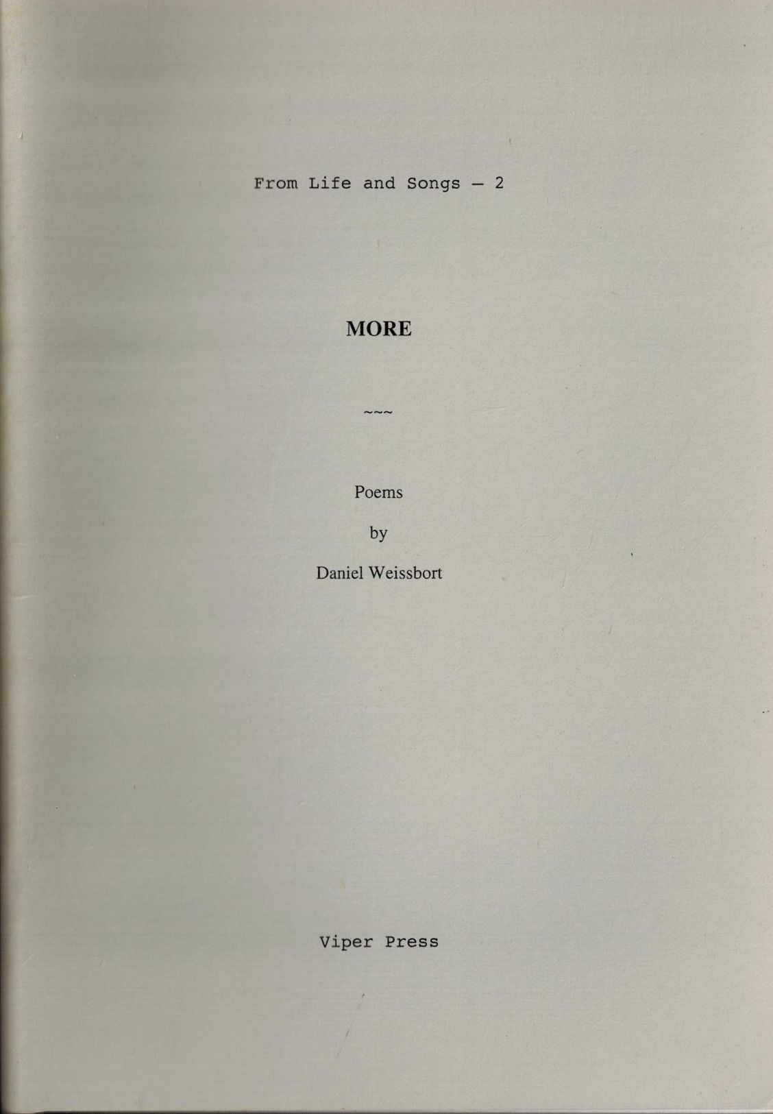 Шифр: 2/9б Weissbort Daniel More: Poems February-April 1987. London: Viper Press, 2004. - 40 p. Источник поступления: Собрание В.П. Полухиной. Рубрики: Зарубежная поэзия и проза