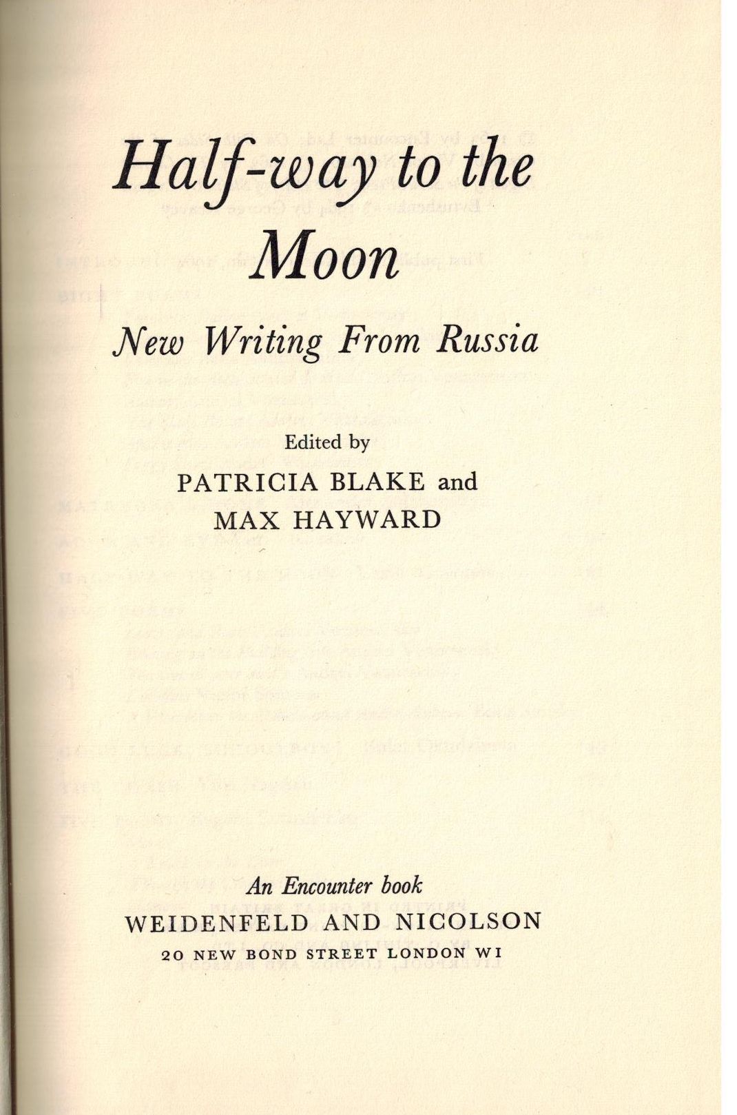 Шифр: 1/10б Half-way to the Moon: New Writing from Russia. Edited by Patricia Blake and Max Hayward. London: Weidenfeld and Nicolson, 1964. Источник поступления: Собрание В.П. Полухиной. Рубрики: Россика Персоны: Ахмадулина Белла Ахатовна / Akhmadulina Bella, Аксёнов Василий Павлович / Aksyonov Vasili, Блейк, Патрисия Пейдж / Blake, Patricia Page, Евтушенко Евгений Александрович / Evtushenko (Yevtushenko) Evgeni, Хейуорд, Макс / Hayward, Harry Maxwell (Max), Нагибин Юрий Маркович / Nagibin Yuri, Окуджава Булат Шавлович / Okudzhava Bulat, Слуцкий Борис Абрамович / Slutsky Boris, Соснора Виктор Александрович / Sosnora Victor, Винокуров Евгений Михайлович / Vinokurov Evgeny, Вознесенский Андрей Андреевич / Voznesensky Andrei, Казаков Юрий Павлович, Некрасов Виктор Платонович, Солженицын Александр Исаевич