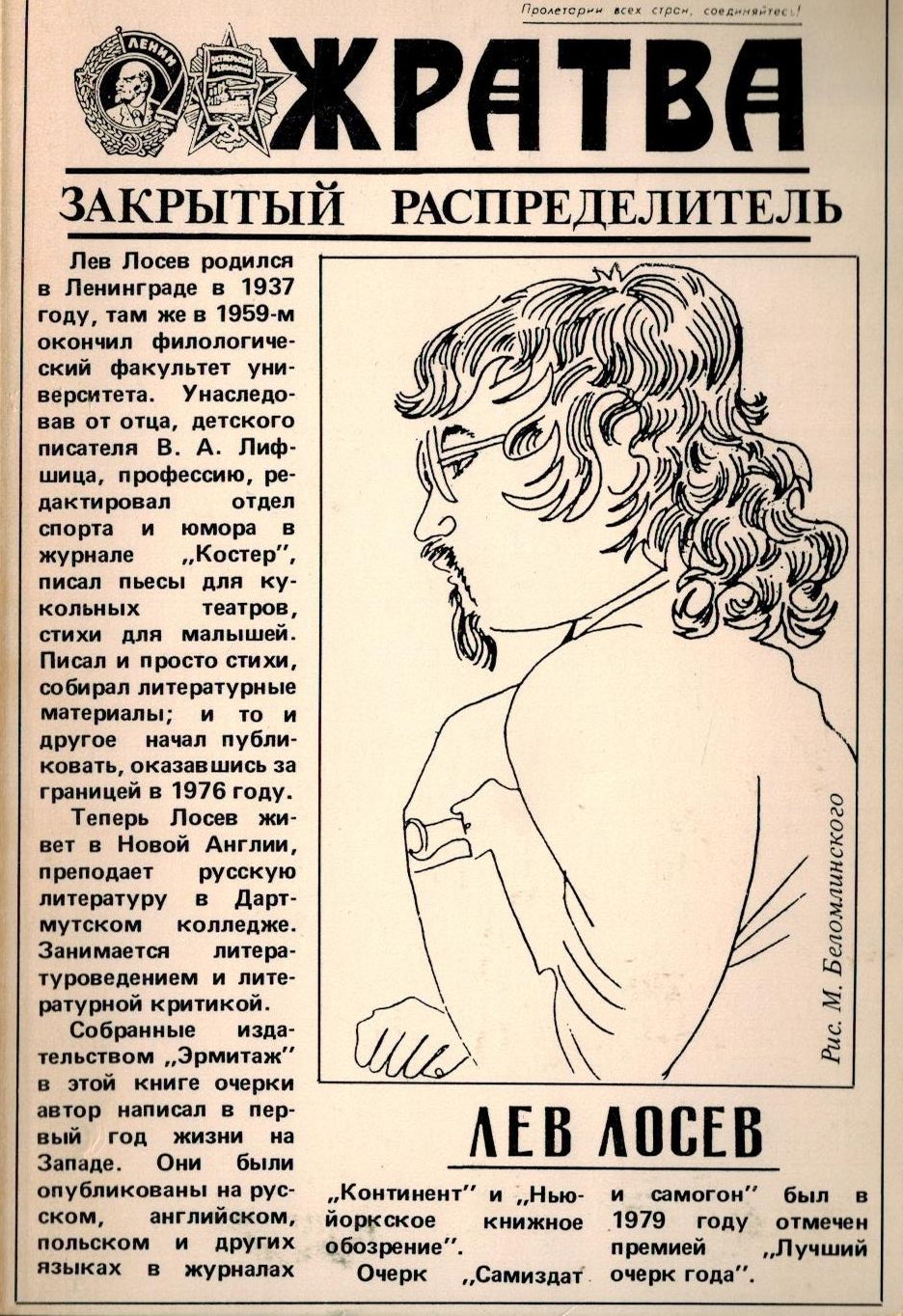 Шифр: 3/8а Лосев Лев Владимирович Закрытый распределитель (Цикл очерков). Оформление обложки Сергея Довлатова (С рисунком М. Беломлинского). Ann Arbor, MI: Hermitage, 1984. - 186 c/ Источник поступления: Собрание В.П. Полухиной. Рубрики: Русская проза Персоны: Беломлинский Михаил Самуилович, Довлатов Сергей Донатович / Dovlatov Sergueï