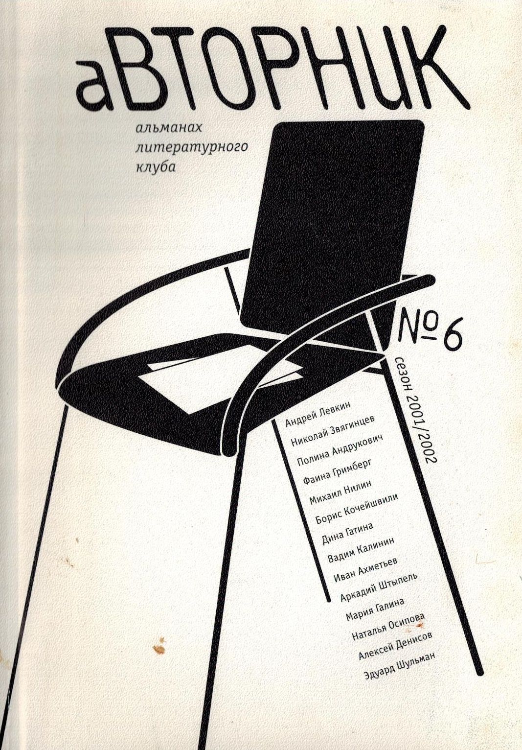 Шифр: 3/3б Авторник: Альманах литературного клуба. Сезон 2001/2002. Выпуск 2 (6). М.: АРГО-РИСК; Тверь: Колонна, 2002. - 96 с. Источник поступления: Собрание В.П. Полухиной. Рубрики: Русская периодика