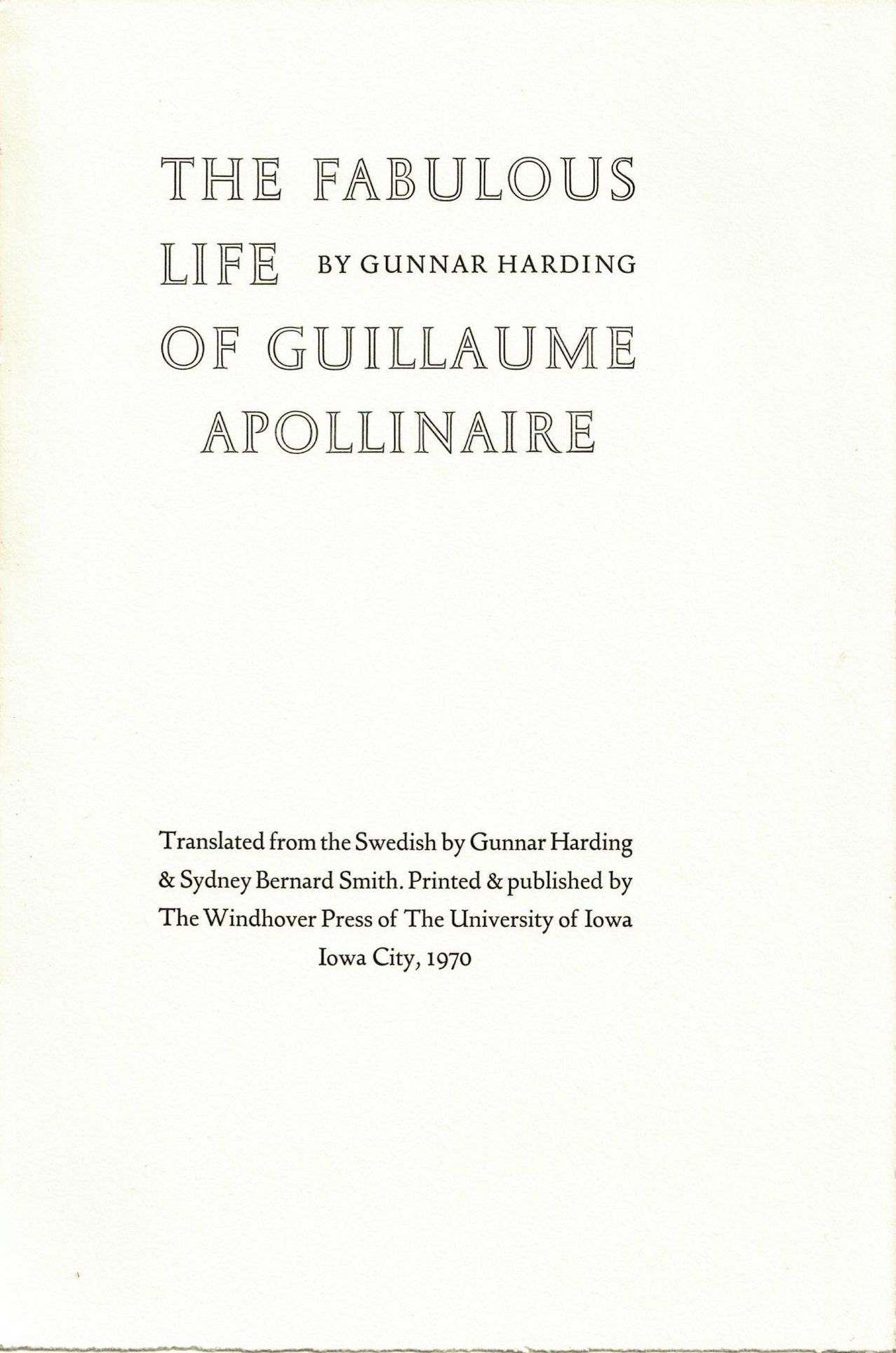 Шифр: 2/8б Harding Gunnar The Fabulous Life of Guillaume Apollinaire. Translated from Swedish by Gunnar Harding and Sydney Bernard Smith. Iowa City: The Windhover Press of The University of Iowa, 1970. - (The Handprinted Book). Источник поступления: Собрание В.П. Полухиной. Персоны: Аполлинер Гийом / Apollinaire Guillaume, Смит, Сидней Бернард / Smith, Sydney Bernard