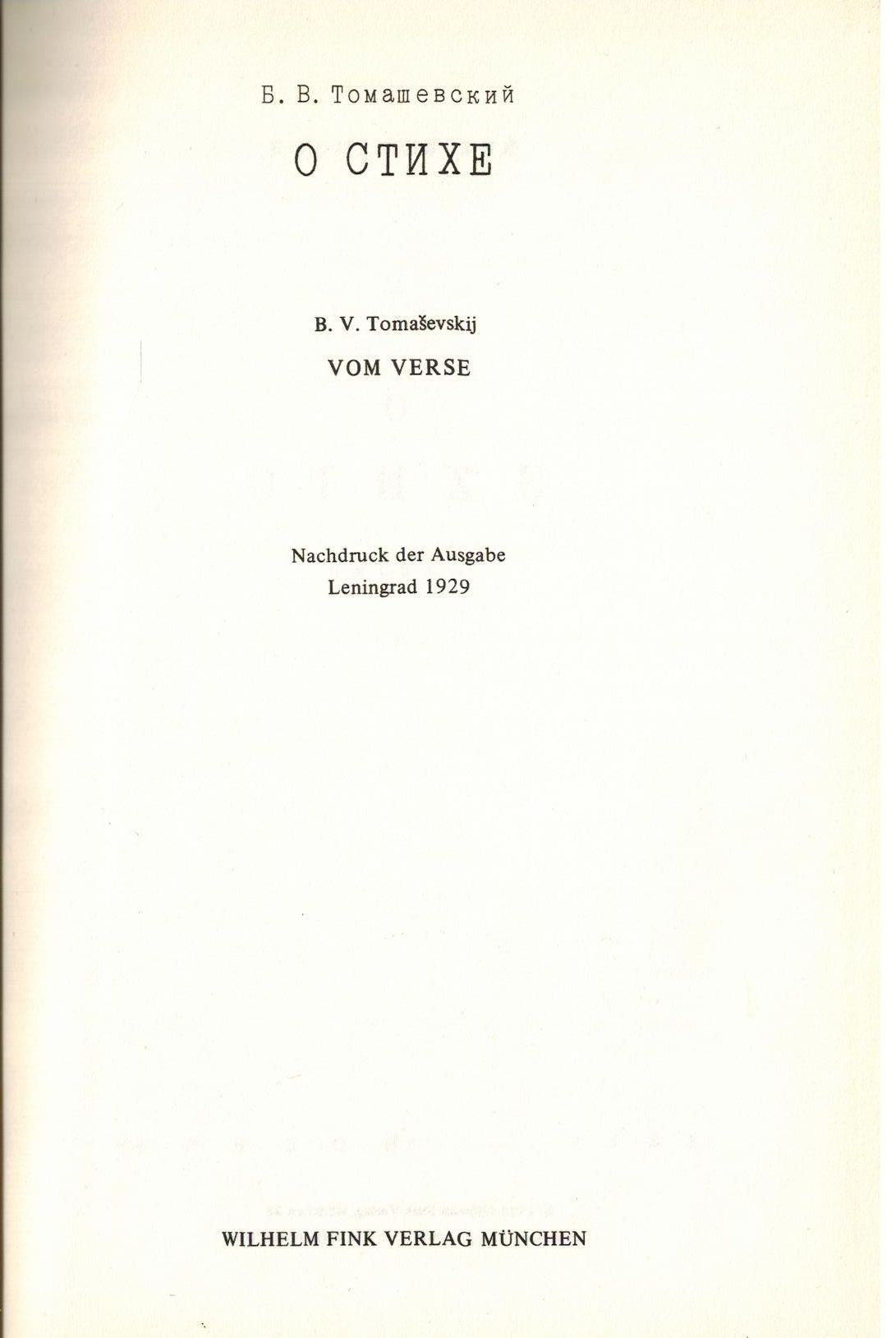 Шифр: 1/9б Томашевский Борис Викторович О стихе: Статьи. Wilhelm Fink Verlag, 1970. - 327 с. - (Slavische Propyläen. Band 75. 1970). Аннотация: Репринтное издание книги Б. Томашевского "О стихе" (Прибой, 1929). Источник поступления: Собрание В.П. Полухиной. Рубрики: Общее литературоведение, Русская поэзия