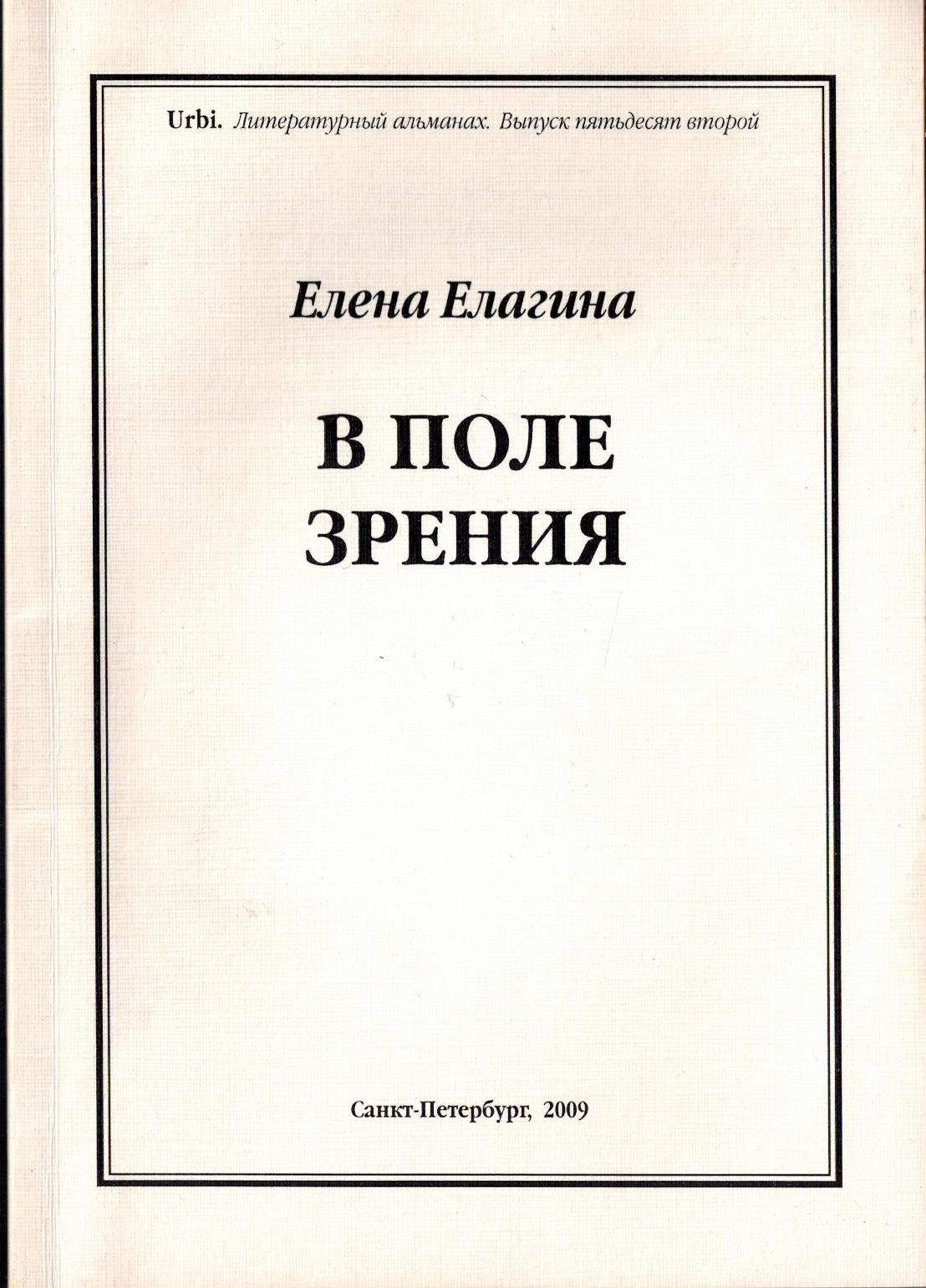 Шифр: 3/6а Елагина Елена Владимировна В поле зрения : Книга стихов. Urbi : литературный альманах. Вып. 52. - Серия "Новый Орфей" (29). СПб.: АО "Журнал "Звезда"", 2009. - 80 с. Надписи: Дарственная надпись В.П. Полухиной от автора. 27.07.2009. Источник поступления: Собрание В.П. Полухиной. Рубрики: Русская поэзия