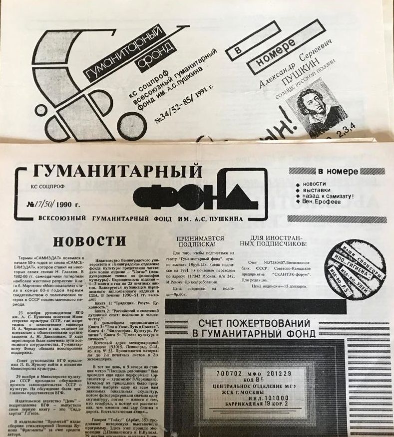 Шифр: 2/2 Гуманитарный фонд Москва. 1990 - № 17 (50); 1991 - №№ 34 (52 - 85) - 37 (55 - 88), №№ 38 (89) - 39 (90), 41 (92) - 43 (94); 1992 - №№ 7 (110), 12 (115), 15 (118), 19 (122), 21 (124), 25 (128), 27 (130), 28 (131), 29 (132), 30 (133), 31 (134), 32 (135), 33 (136), 41 (144); 1993 - №№ 2 (24 - 179), 13 (35 - 190), 14 (36 - 191); 1994 - №№ 1 (1), 9 (9). Аннотация: Газета, посвященная современному искусству. Выходила в Москве с 1989 по 1994 год. Финансировалась Всесоюзным гуманитарным фондом им. А.С. Пушкина и частными лицами. Источник поступления: Собрание В.П. Полухиной. Рубрики: Русская периодика