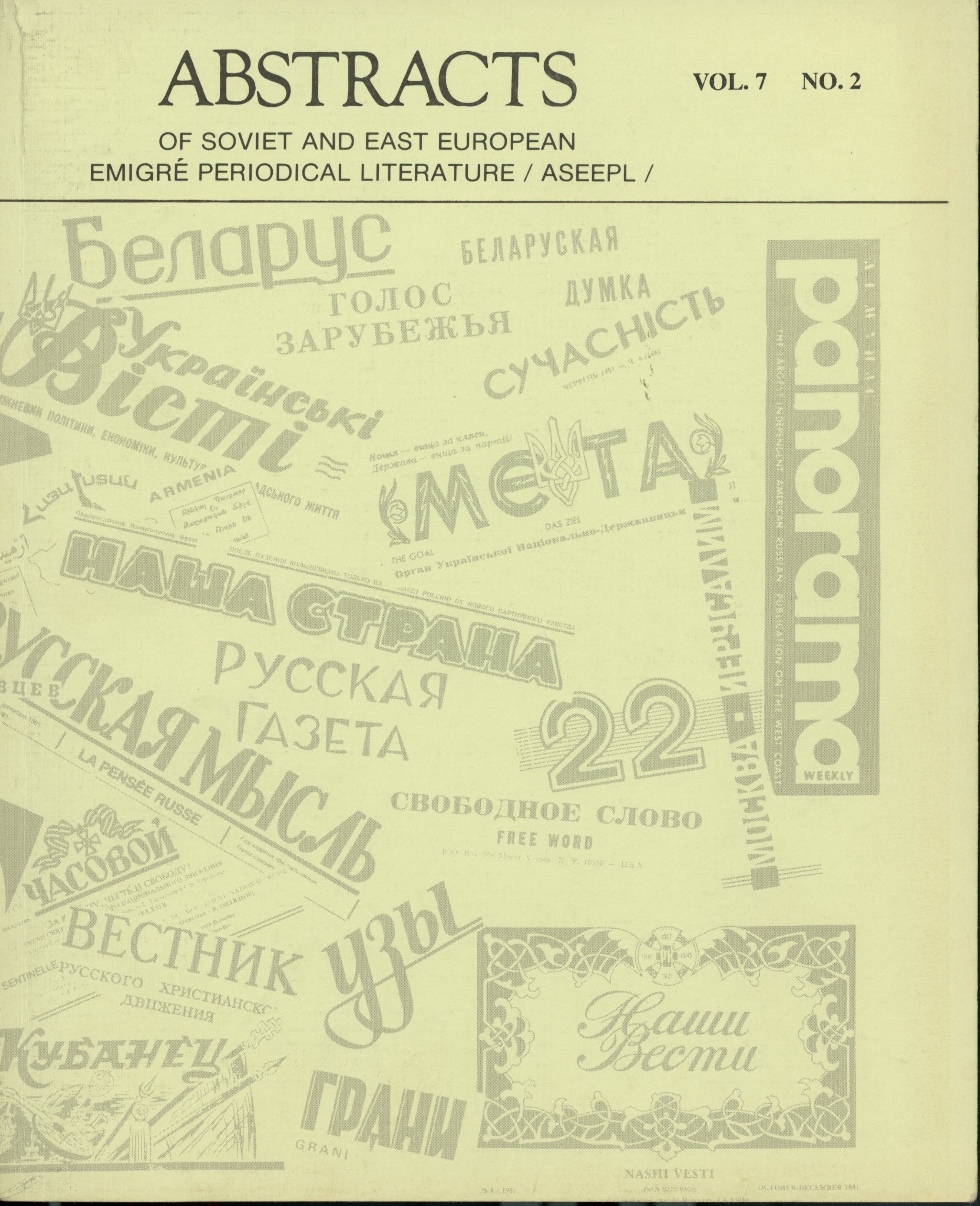Шифр: Вершик Abstracts of Soviet and East European Emigre Periodical Literature (ASEEPL). Vol 7. No. 2. 1989. 128 p. Источник поступления: Дар А.М. Вершика Рубрики: Русская поэзия, Русская проза