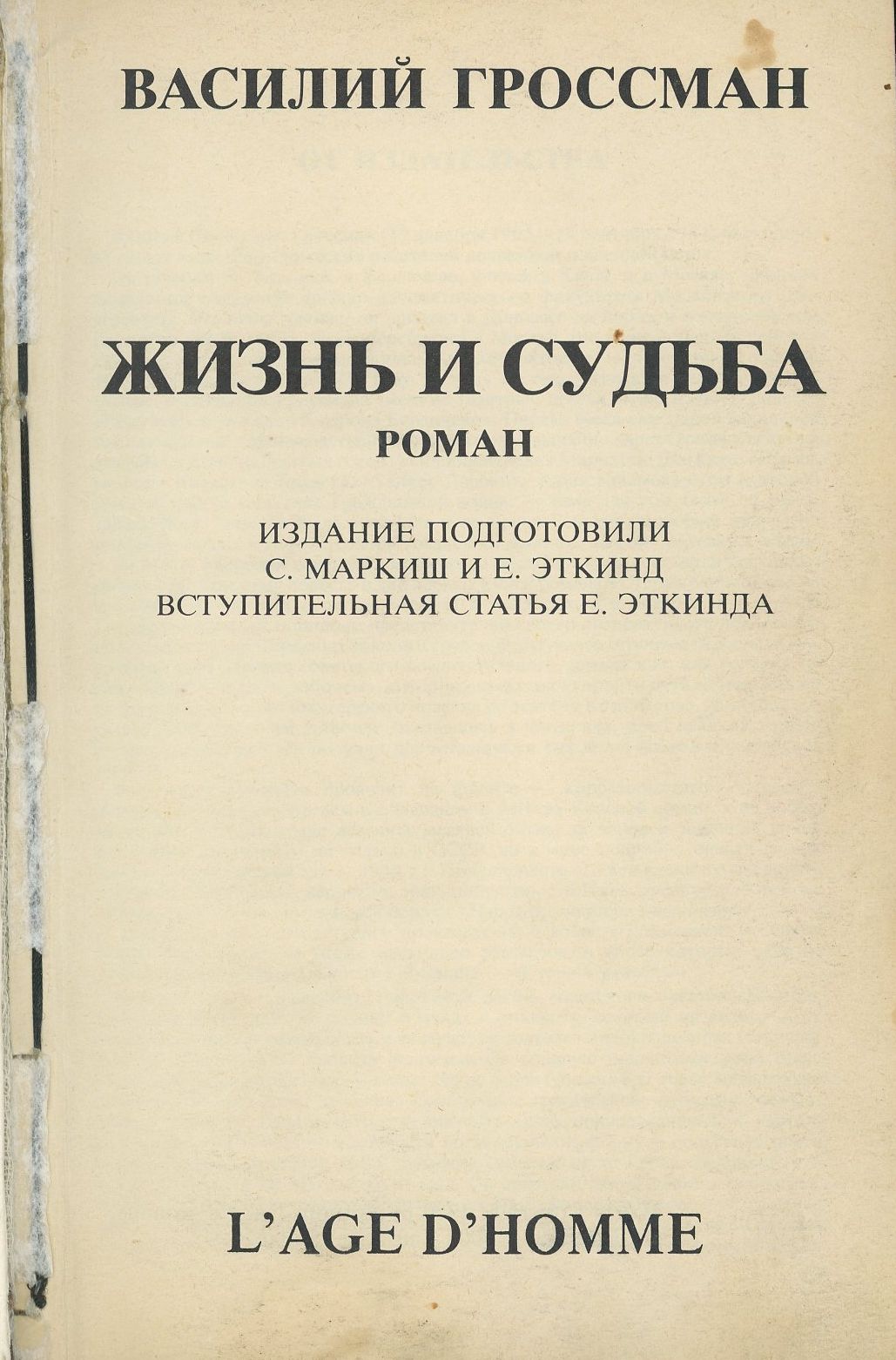 Шифр: Вершик (ФРК.КАВ.17). Гроссман Василий Семенович Жизнь и судьба. Роман в трех частях Издание подготовили С. Маркиш и Е. Эткинд. Вступит. статья Е. Эткинда. Métropole: L’Age d’Homme: 1980. - 216 с. Источник поступления: Дар А.М. Вершика Рубрики: Русская проза
